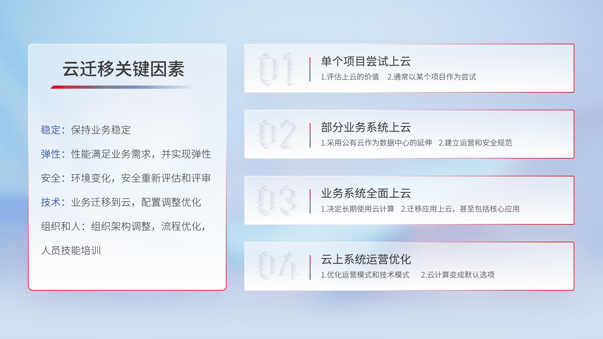 结合实际业务,,,,从规划设计、、、、云平台选型、、、、云原生改造、、、数据迁移、、、集成交付,,迁移全过程为客户识别最佳上云路径,,,,做好风险识别管理,,,设计网络架构、、、身份权限、、、安全审计合规、、操作审计、、日志审计、、、监控告警策略、、、、多站点容灾设计等,,,对云上基础设施进行整体规划,,提升IT治理水平,,以满足弹性、、高可用、、、高性能的需求。。